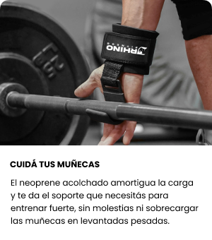 Entrená más fuerte y levantá más pesado con nuestros RHINO STRAPS: acolchados, súper resistentes y diseñados para mejorar tu agarre y proteger tus muñecas en levantamientos pesados.